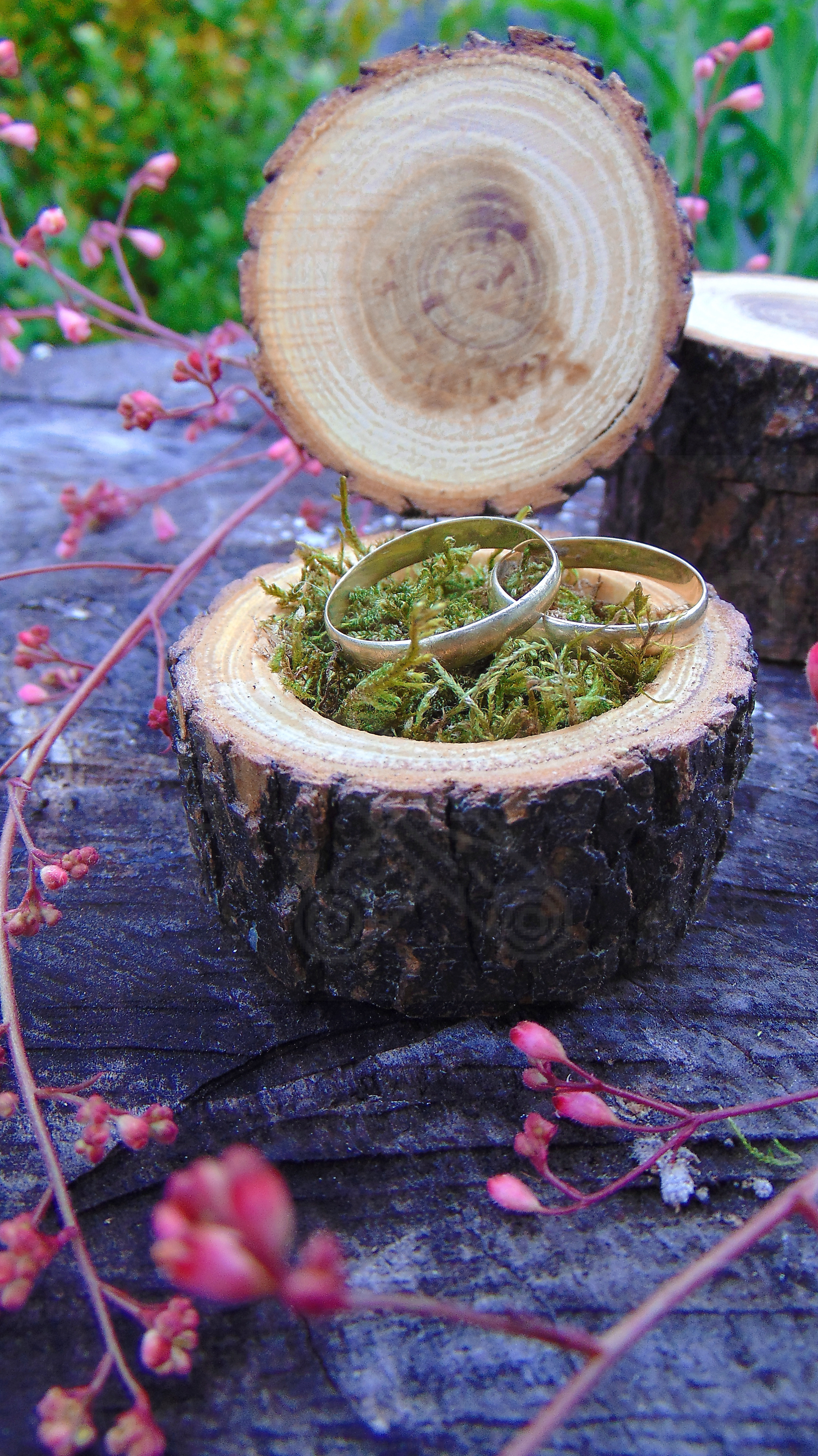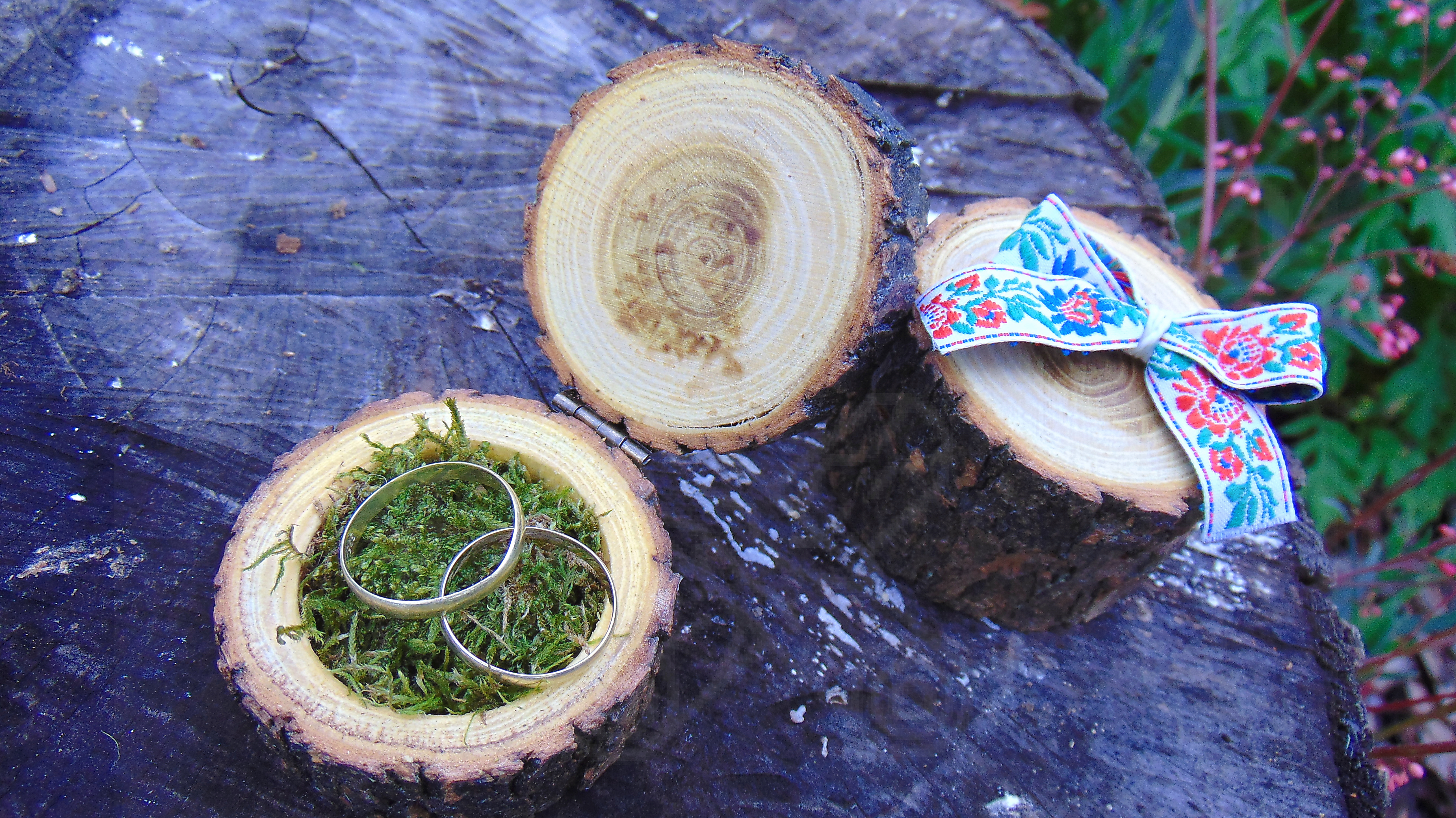 Krabička na obrúčky je vyrobená z agátového dreva s jutovou výstelkou. Predstavuje spojenie prírody a jemnosti. Povrch je ošetrený ľanovým olejom a dozdobený drobnou dekoráciou.