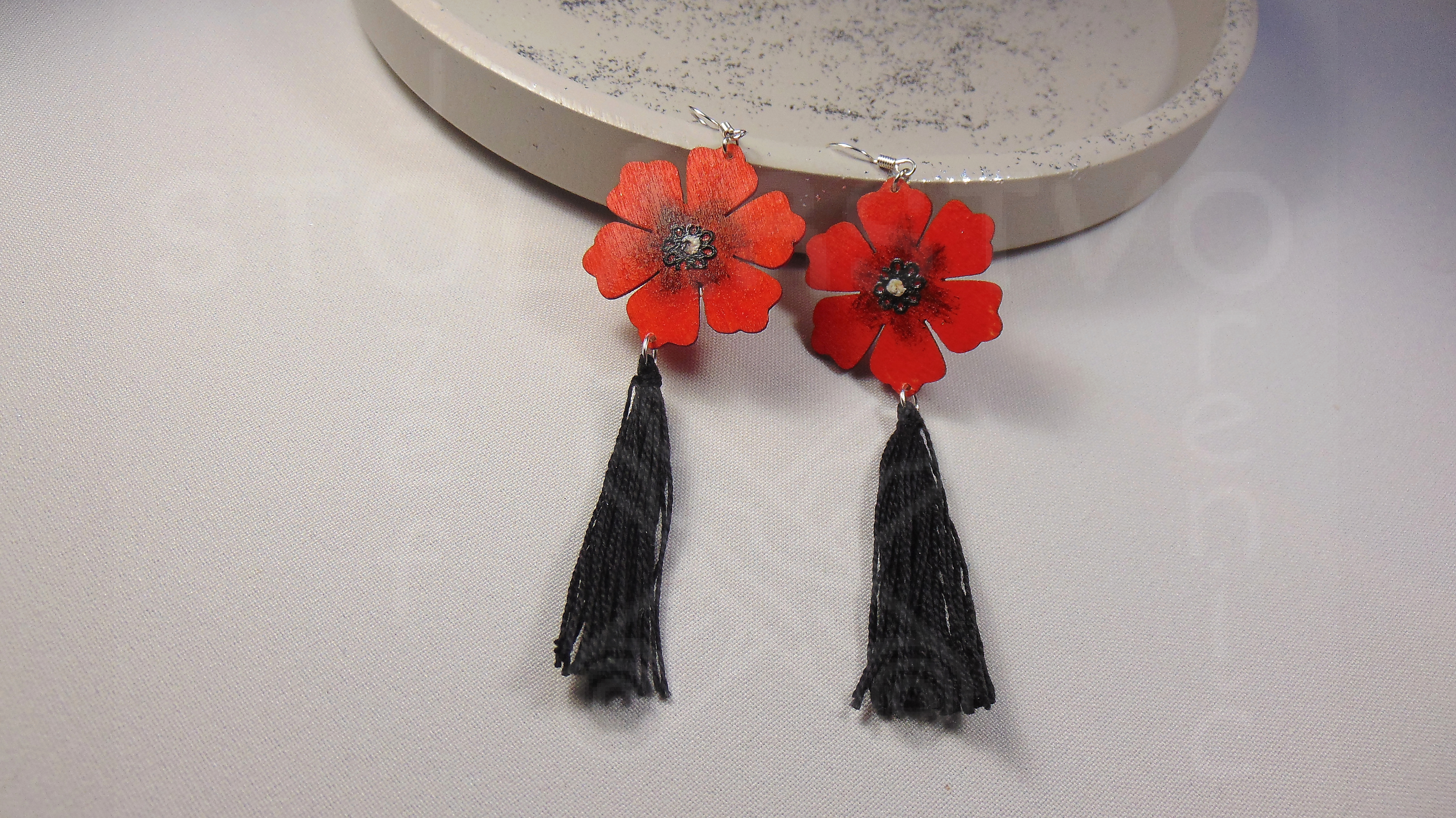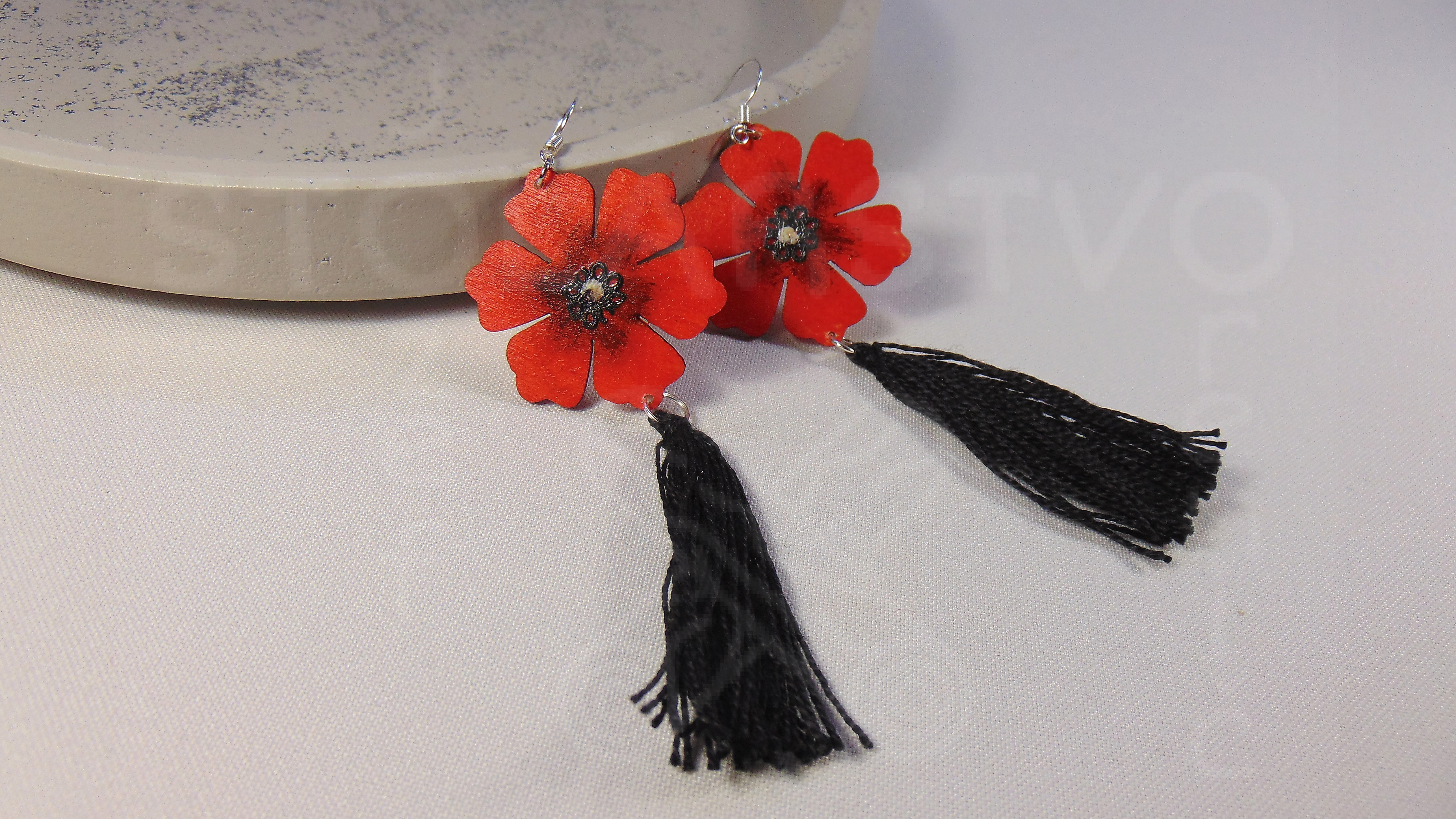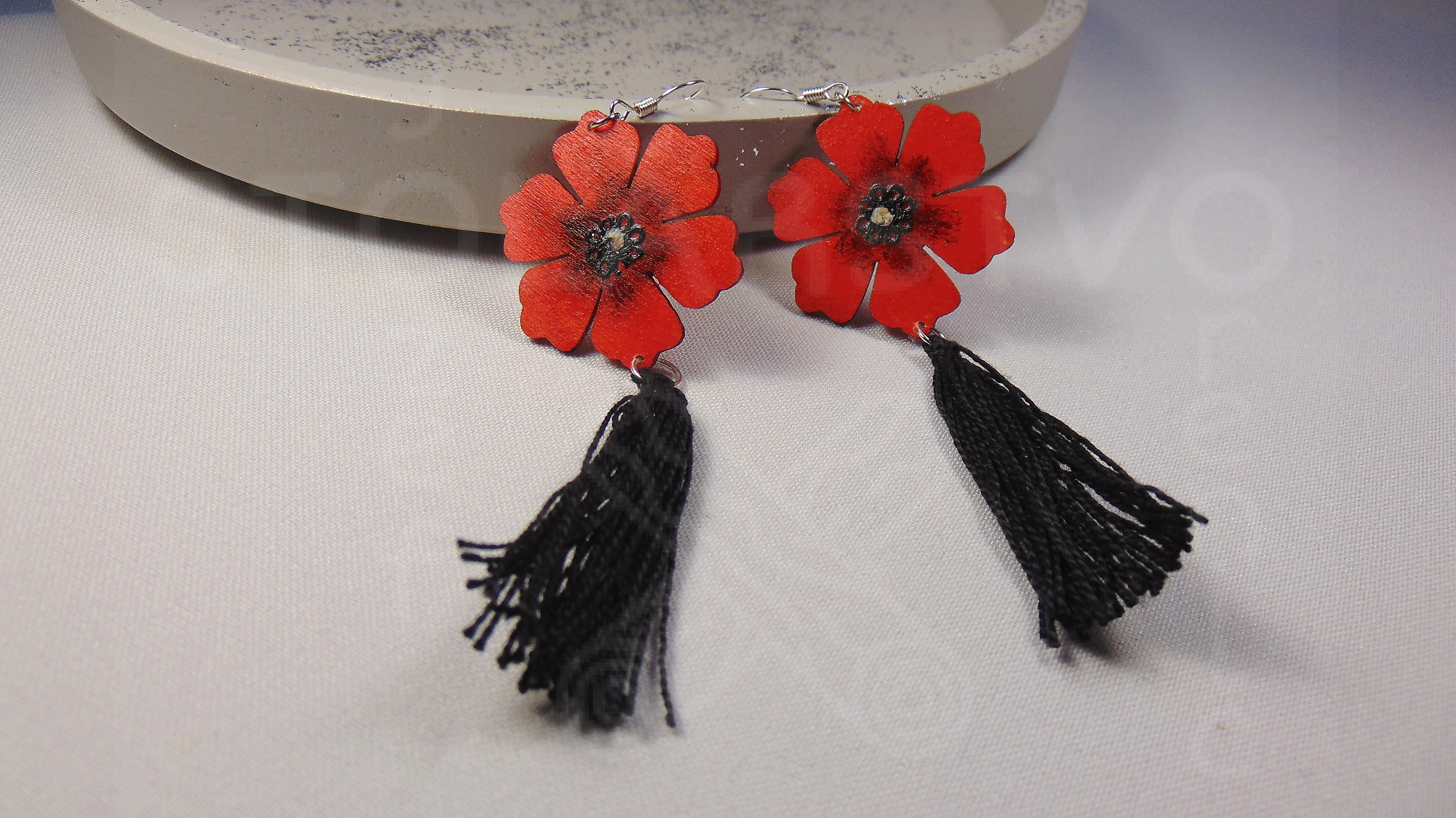 Náušnice Divé maky sú vyrobené z tenučkej 0,1 cm preglejky. Vďaka tomu ich váhu na ušiach takmer nepocítite. Maľované akrylovými farbami a povrch je natretý akrylatovým lakom. Záves tvorí strieborný bižutérny kov a celková dĺžka náušníc je 10 cm a šírka 3,5 cm.