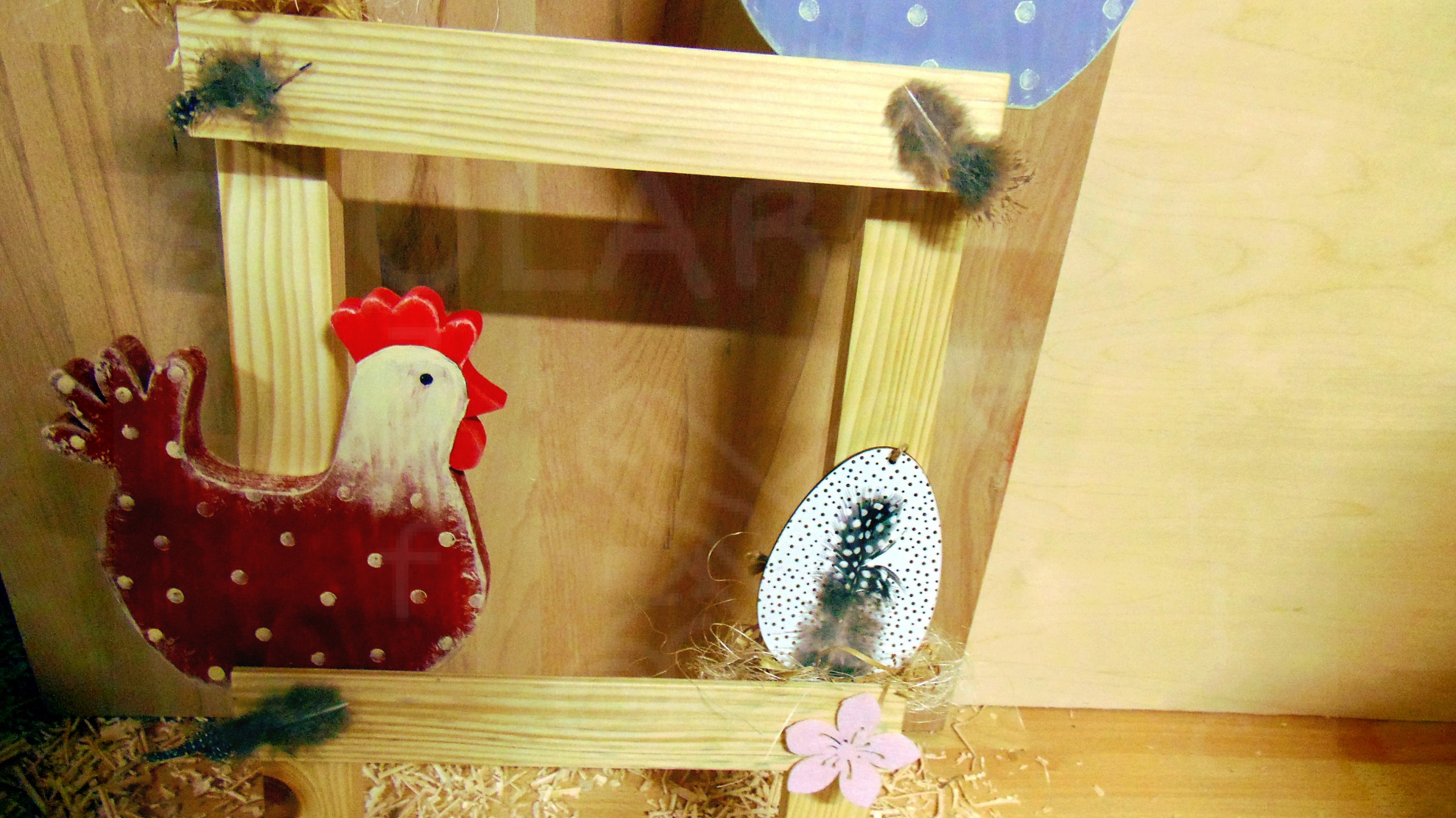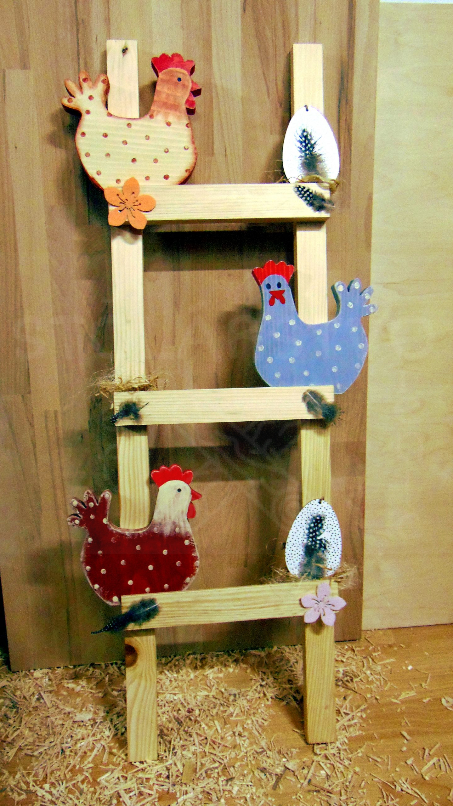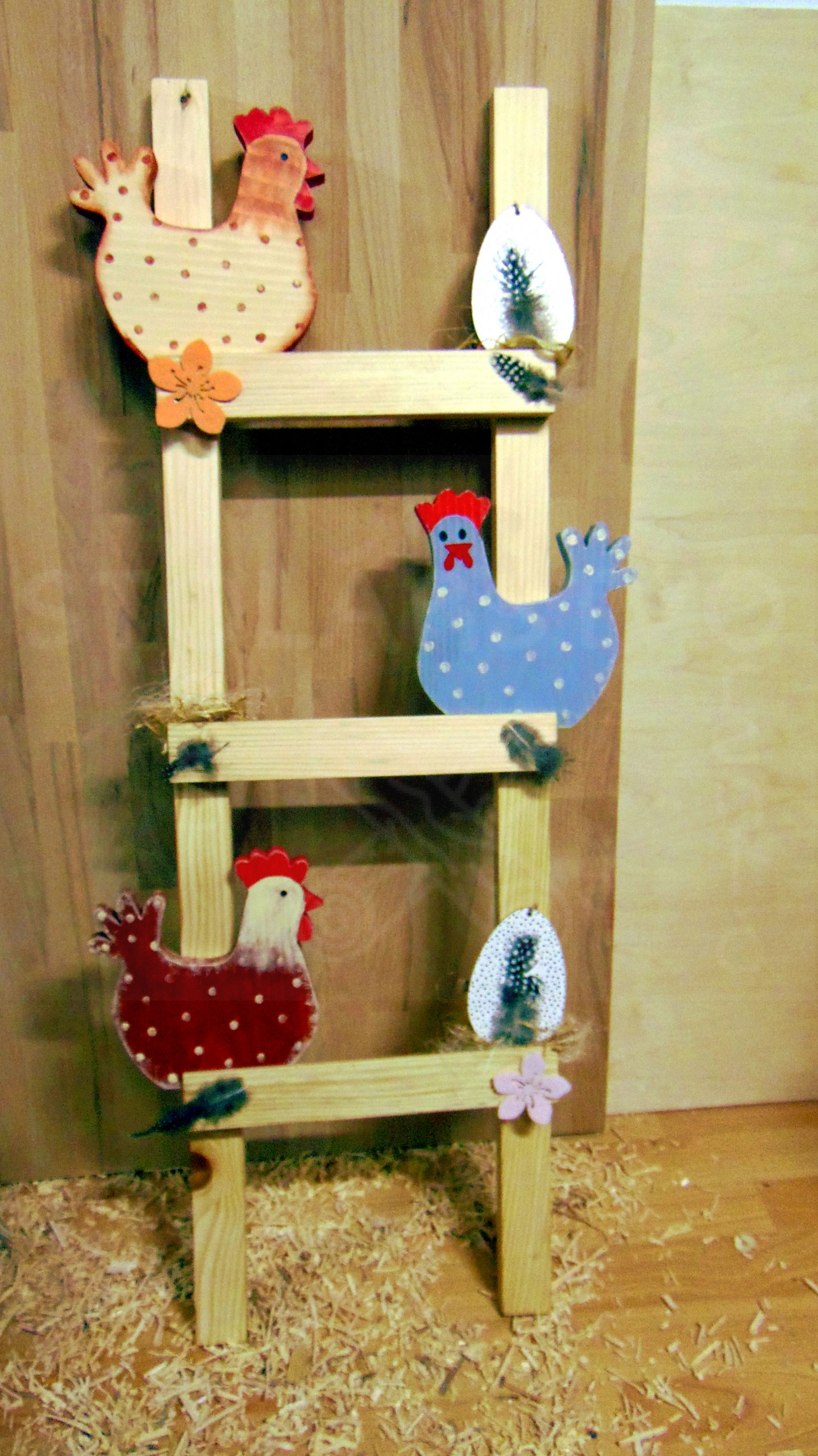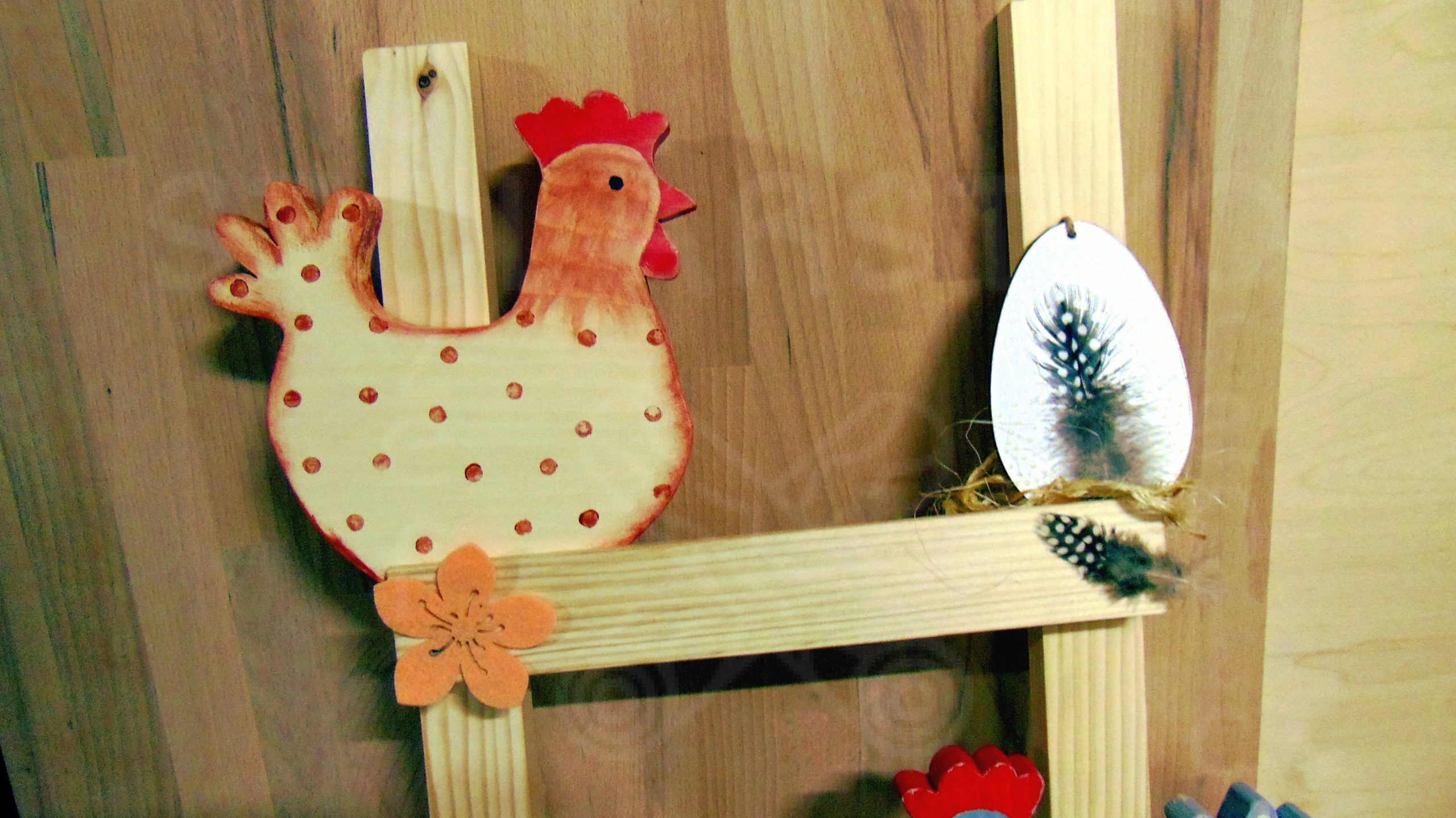 Dekorácia je vyrobená zo smrekového dreva. Sliepočky ručne farbené akrylovými farbami, rebrík natretý ľanovým olejom, dozdobený kvetmi z filcu, pierkami a vajíčkami. Sliepočky štandardne sú 3 a to béžovej, sivej a hnedej farby s bodkami. Ak by ste mali iné požiadavky, je potrebné do poznámky uviesť pri objednávke aj želané farby.